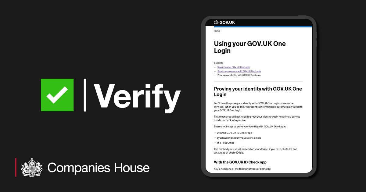 Individuals can verify their identity with Companies House through GOV.UK One Login, or through an Authorised Corporate Service Provider (ACSP).
